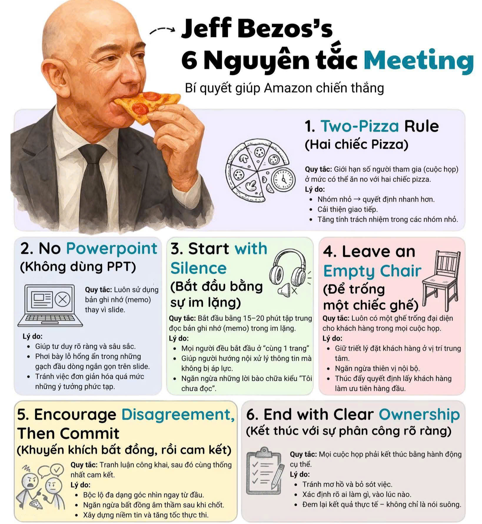 Jeff Bezos, nhà sáng lập và cựu CEO của Amazon, nổi tiếng với cách tiếp cận quản lý sáng tạo, tập trung vào hiệu quả và văn hóa lấy khách hàng làm trung tâm. Một trong những đóng góp quan trọng của ông là bộ nguyên tắc họp được thiết kế để loại bỏ lãng phí thời gian, khuyến khích sáng tạo và đảm bảo quyết định chất lượng cao. Những nguyên tắc này đã góp phần quan trọng vào sự thành công của Amazon, giúp công ty phát triển từ một cửa hàng sách trực tuyến thành đế chế thương mại điện tử toàn cầu với giá trị hàng nghìn tỷ USD.