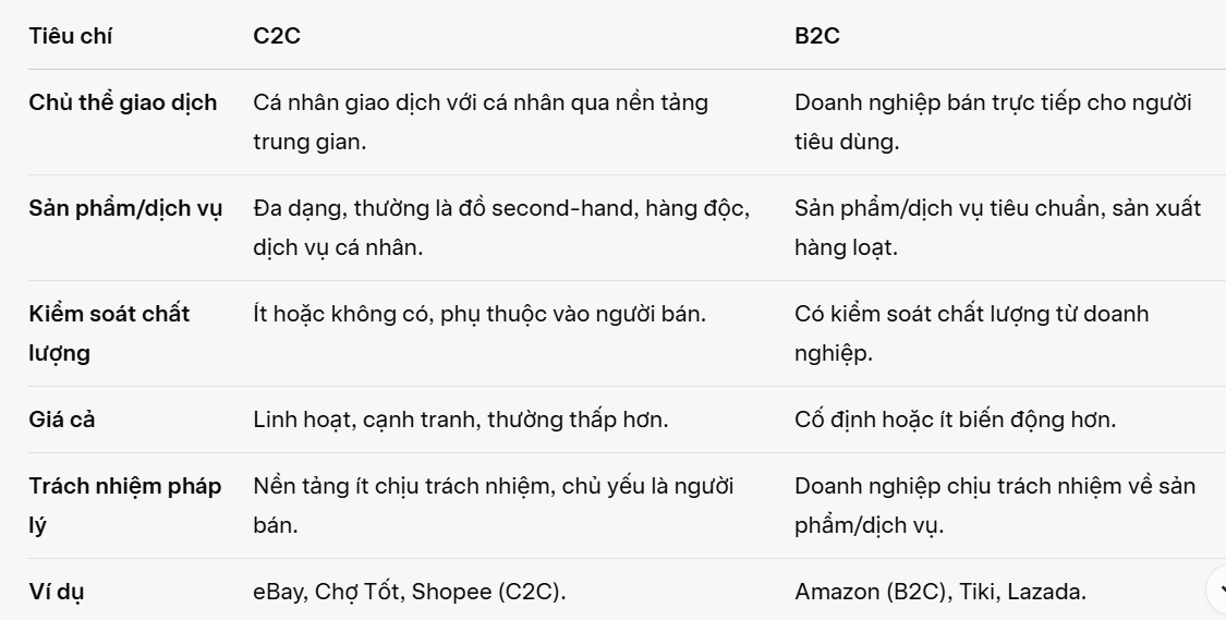 - Thiếu quy định rõ ràng: Ở Việt Nam, giao dịch C2C chưa có khung pháp lý chặt chẽ, dễ dẫn đến tranh chấp.